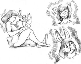 "If we were bigger?" Nikon questioned over her shoulder with a glint in her eye. Tina knew the note in Nikon's voice and retreated to a safe distance as the new bunny began to shrink. It might have taken an entire second for her to drop to an full eight inches tall. "Bunnies should be cute little things anyways!" she smiled. From their holder on the counter she took six toothpicks, then with another quick spell had a serviceable tripod which she deftly attached to her camera. Auto shoot was a very nice feature, but a well composed shot took a little time to set up. Nikon set the camera to take the last two shots on the card before joining the pair in front of the lens.